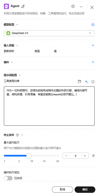 可绑定手动创建的插件或预制插件,当模型识别到需要调用工具来完成任务时,会根据用户的输入提取参数完成插件调用,并总结插件执行结果。