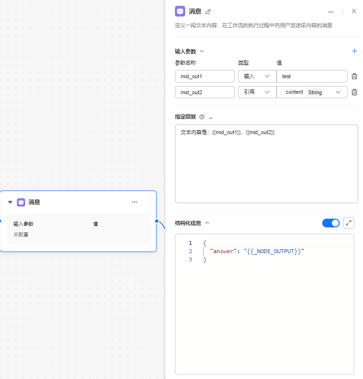 功能开启时,可使用{{_node_output}}引用“指定回复”中的信息实现结构化输出。