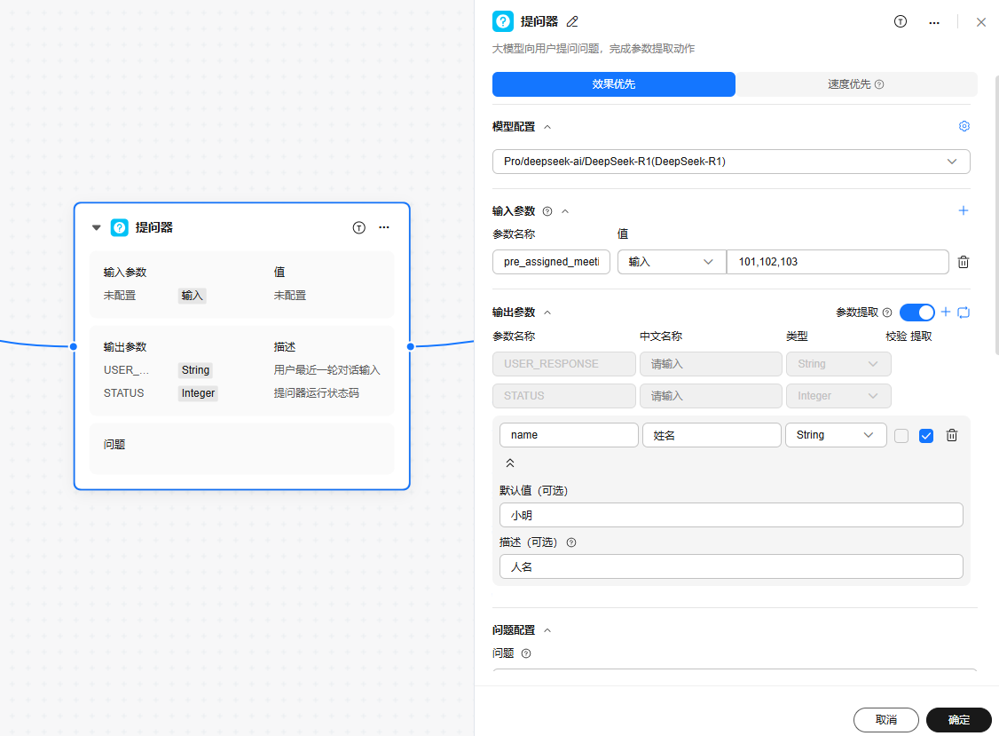 提问器模型用于接收用户自然语言,提取用户配置的输出参数,效果优先时还用于提取结果反思和纠正。