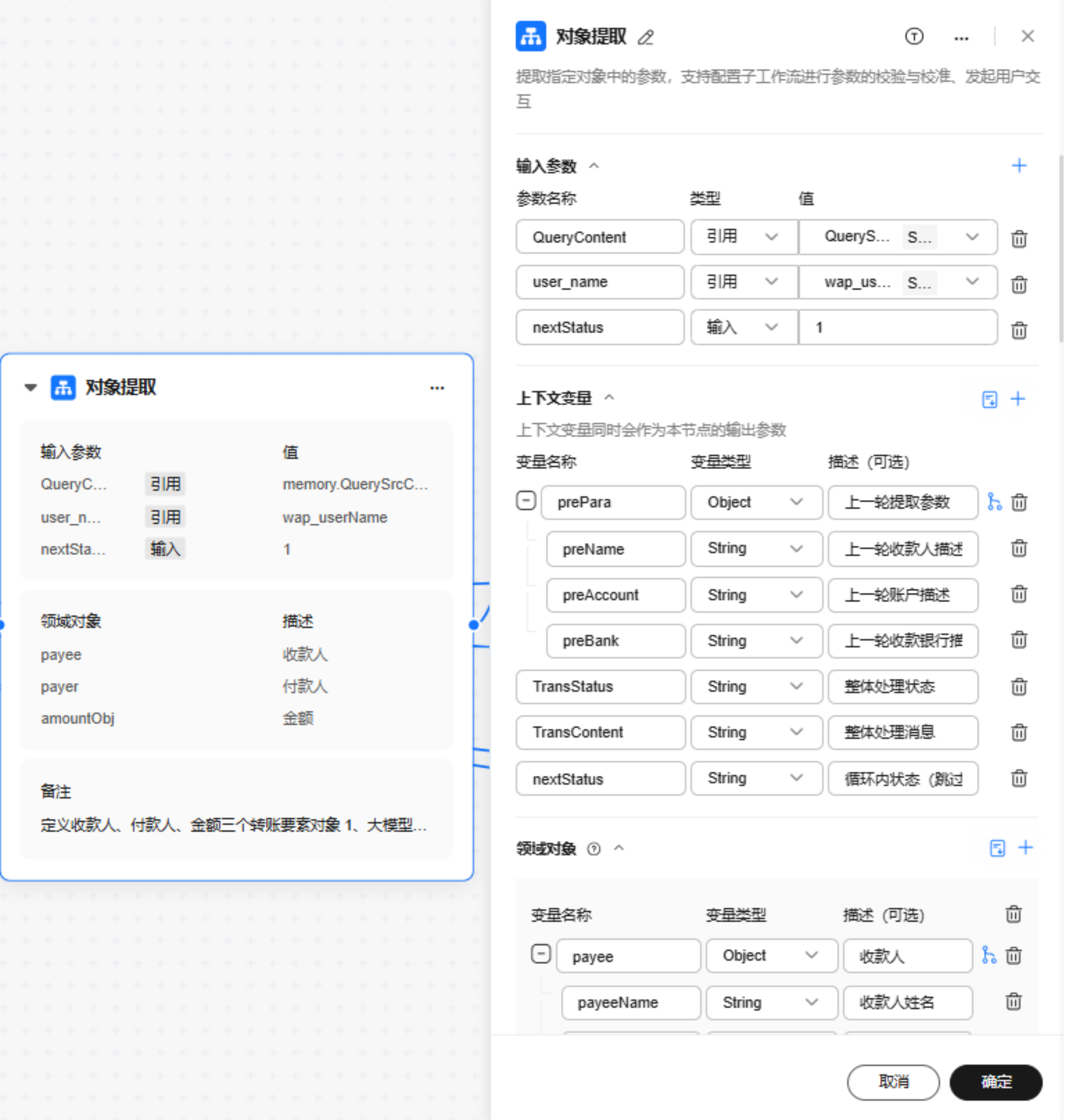 对象提取节点用于提取指定对象中的参数,并支持配置子工作流进行参数的校验与校准,以及触发用户交互流程。