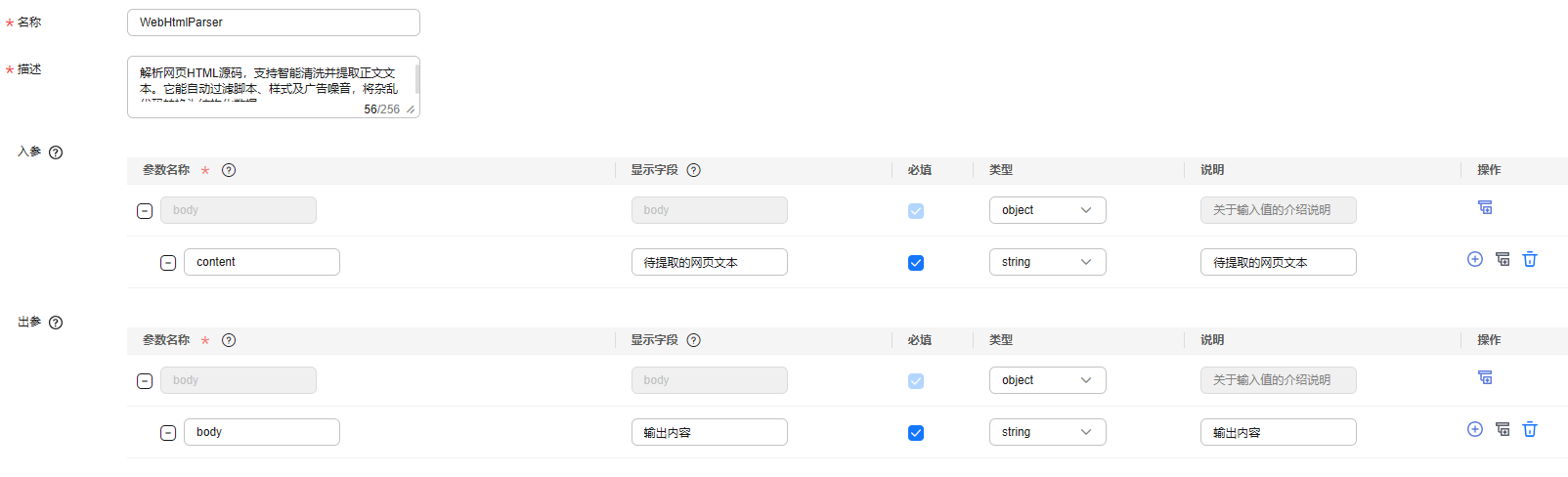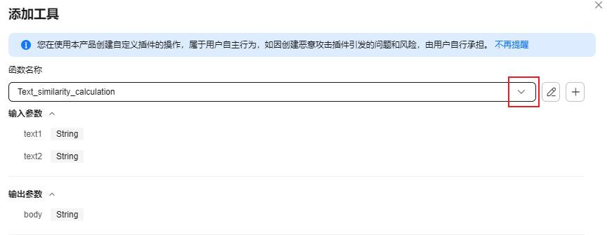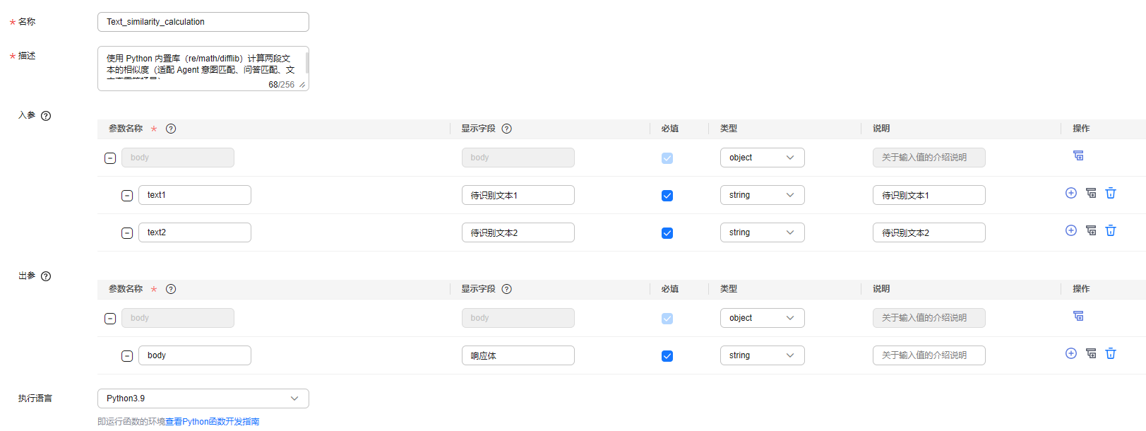 输出参数在本次示例代码中,定义在body参数中,因此需要新增一个body参数。返回的json体会包含 similarity(相似度数值)。图2 设置输入、输出参数