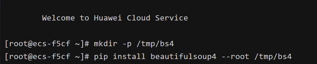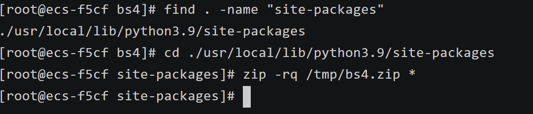 - 依次执行以下命令,下载python的beautifulsoup4依赖包,并将其压缩为zip包。
