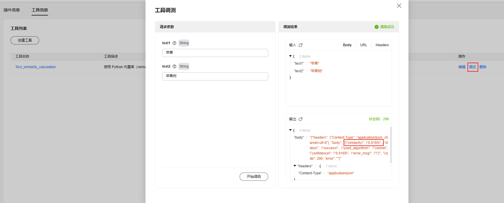 - 在“工具列表”页面,单击“调试”按钮,输入参数值,单击“开始调测”检查调测结果。