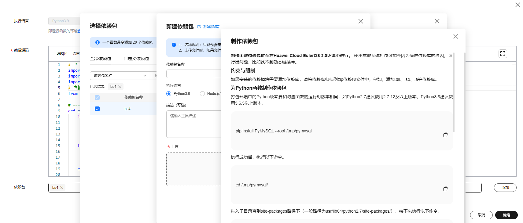 制作函数依赖包推荐在huawei cloud euleros 2.0环境中进行。 使用其他系统打包可能会因为底层依赖库的原因,运行出问题,比如找不到动态链接库。