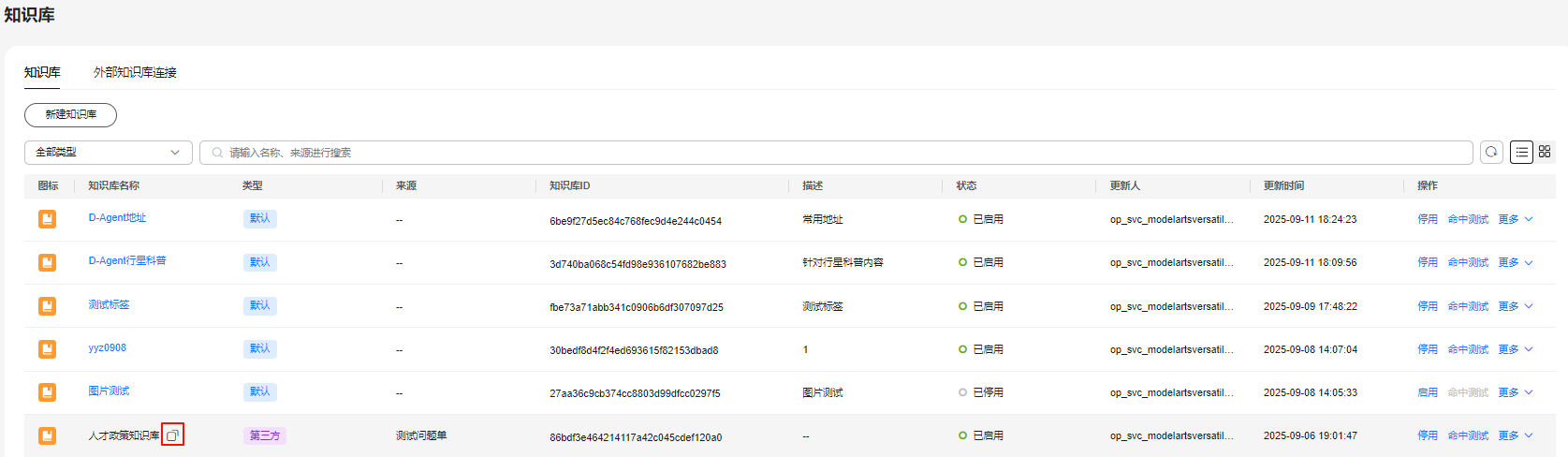 只有“状态”是“已启用”的知识库才能命中测试,详细操作请参见ragflow第三方知识库命中测试。 |