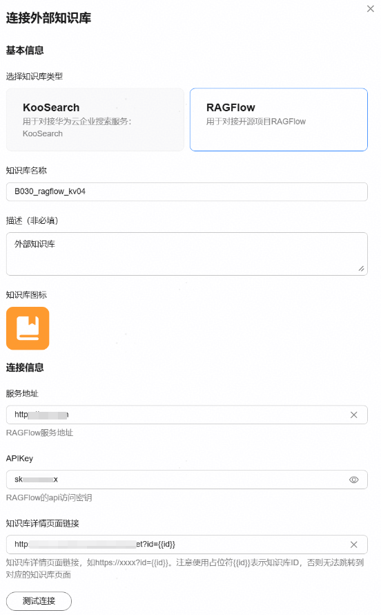如果显示“第三方知识库连接失败,请检查连接地址和认证信息”,请检查ragflow服务是否支持在公网使用api访问。