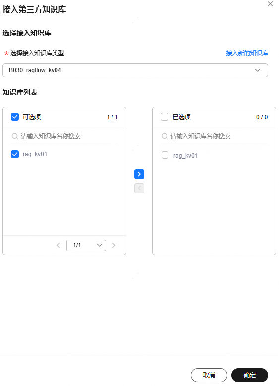 - 在“接入第三方知识库”界面中,单击“选择接入知识库类型”下拉框,从中选择需要接入的第三方知识库,“选择接入知识库类型”取值示例:b030_ragflow_kv04。