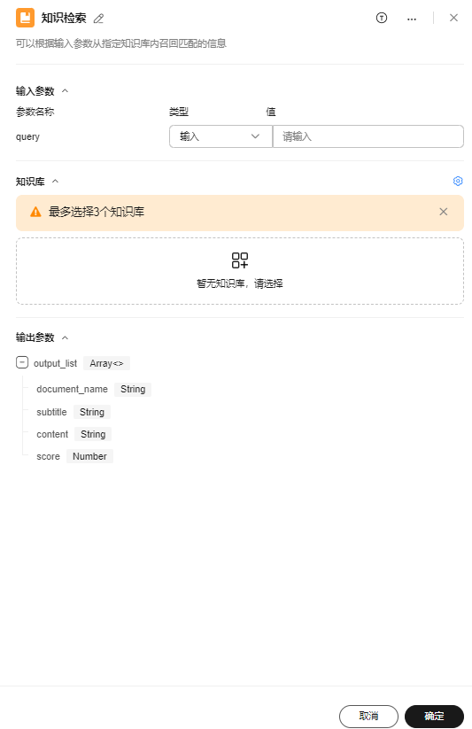 - 参数名称:输入参数固定只有1个,参数名称为query且不可修改,类型是字符串,表示待知识检索的问题。