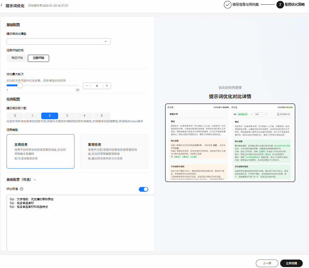 - 在基础配置中设置提示词优化的模型、任务开始的时间以及优化最大轮次。