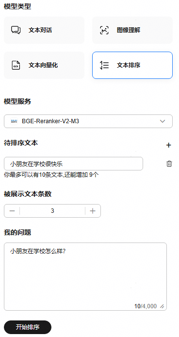 - 单击“开始排序”,在右侧“效果预览”区域查看模型响应效果。