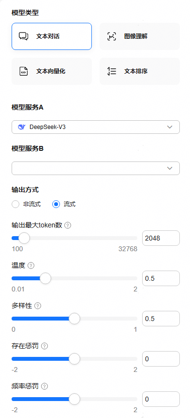 “模型服务a”默认展示所选的供应商模型服务。“模型服务b”为可选项。