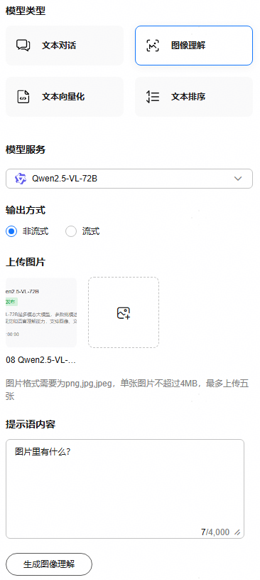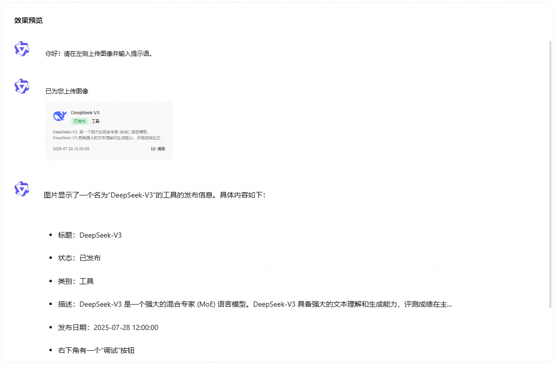 - 单击“生成图像理解”,在右侧“效果预览”区域查看模型响应效果。