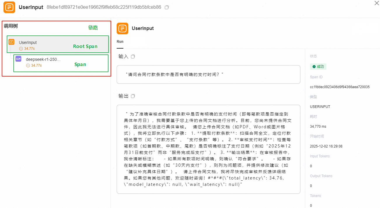 agentarts智能体平台为开发者提供了完整的链路请求调用记录的可视化展示,具体包括以下部分: