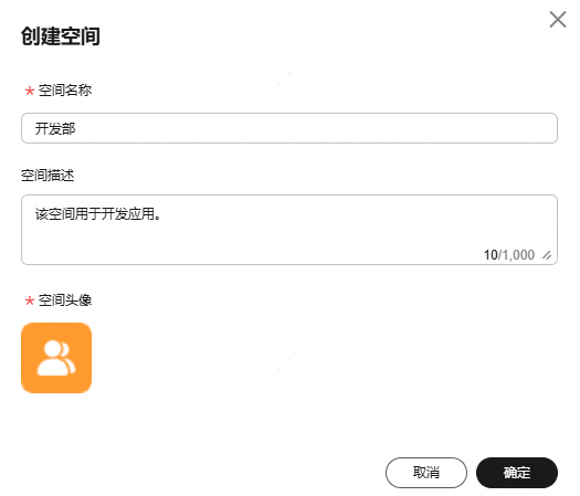 - “在创建空间”页面,配置空间信息,创建空间参数说明请参考创建团队空间,单击“确定”。