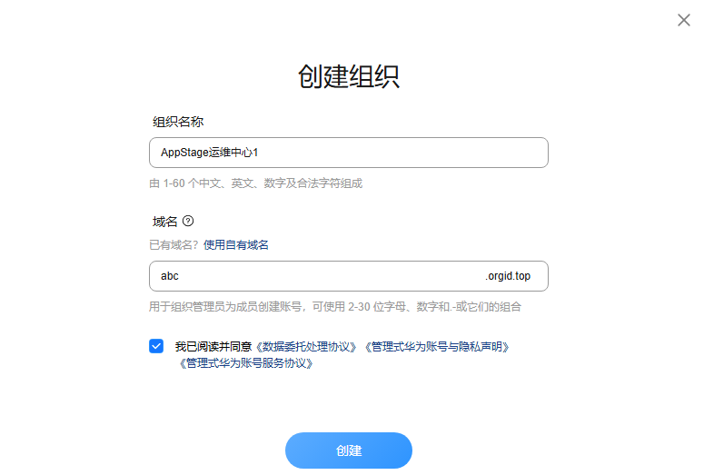 - 在“关联组织”页面,单击“前往orgid”,在“创建组织”页面,如图1所示,参数配置请参考表1。