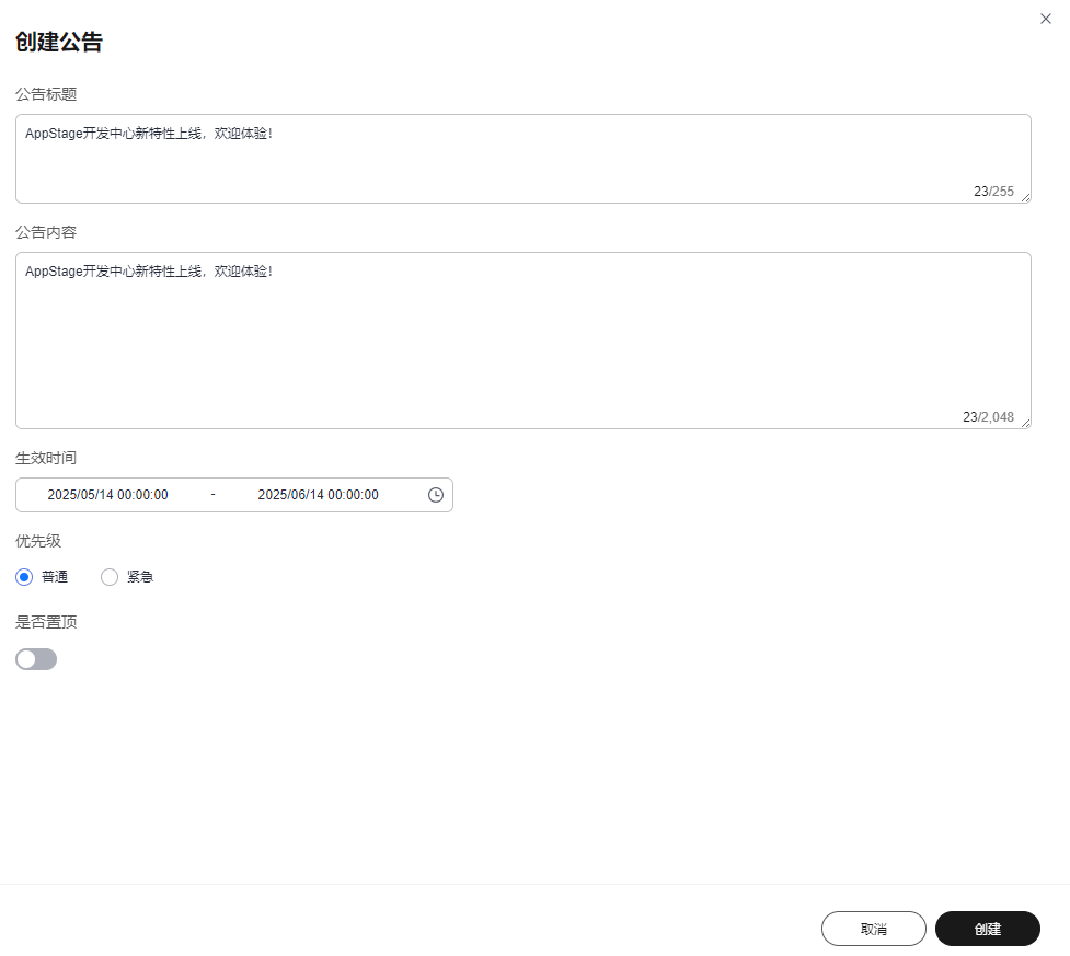 - 在“创建公告”页面,输入公告的相关参数信息,如图1所示,参数说明请参考表1。