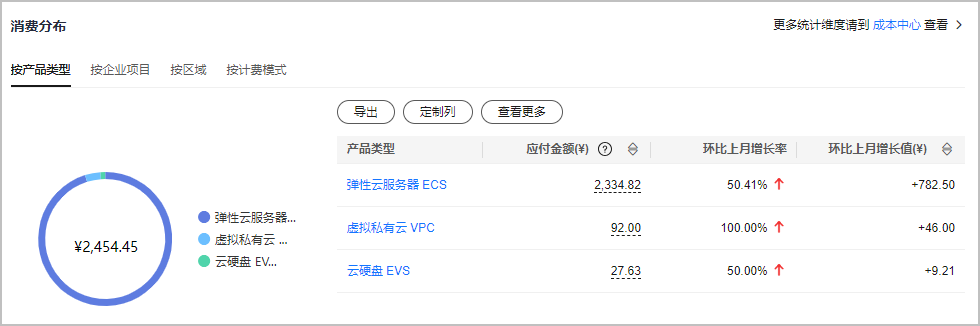 支持从产品类型、项目、区域和计费模式四个维度,左侧以环形图形式展示各分类项比例,右侧以列表形式展示各分类项费用详情(如:应付金额、环比上月增加率、环比上月增加值)。更多的统计维度,可单击卡片右上角的查看。