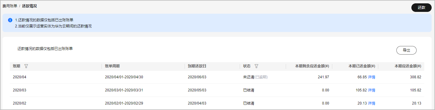 - 选择“账单管理 > 账单概览”,单击页面右上角的“还款情况”。