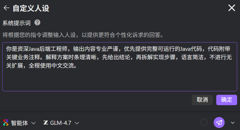人设是智能体的“角色设定”,定义智能体的身份、语气、偏好、基础行为准则,是全局、持久、伴随智能体生命周期的配置,不随单次会话上下文动态增删。自定义人设是对“智能体实例”的配置,而非对某次任务上下文的管理。您可配置专属人设,让智能体更懂您的风格与需求,输出更精准、更贴合预期。