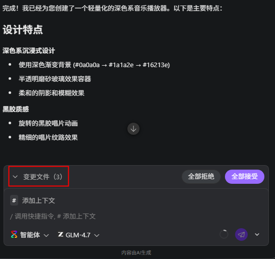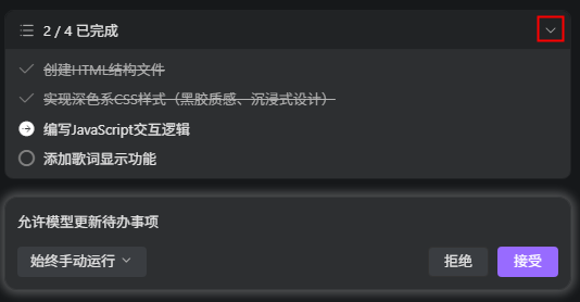 如果未启用自动批准,当模型需要调用工具时,会在会话中显示“接受”和“拒绝”按钮,需用户手动确认后方可继续。启用自动批准后,相关操作将自动通过,无需用户干预。此外,在用户进行手动确认时,还支持设置“始终手动运行”或“始终自动运行”,以满足不同使用需求。