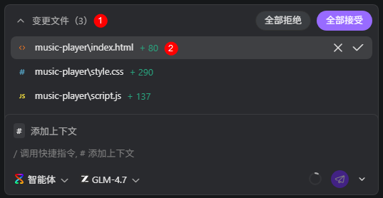 在智能体完成代码生成或优化后,可通过diff视图直观查看所有修改细节。新增、删除代码行将以不同颜色高亮展示,帮助开发者快速审核变更内容,确保代码调整精准可控。
