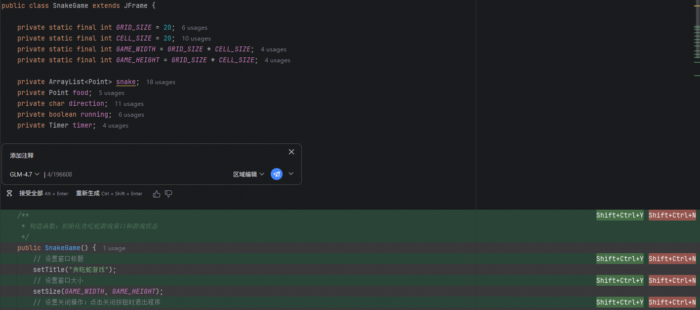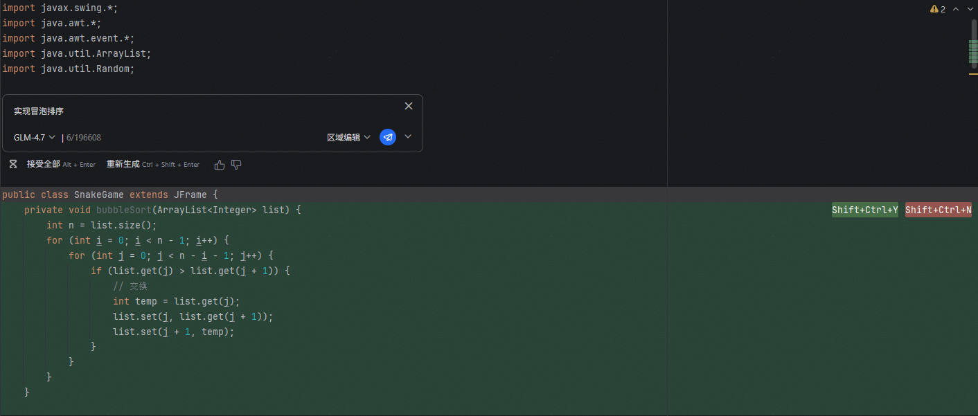 - 区域编辑:根据选中代码、需求描述、上下文等信息,对当前文件进行修改。