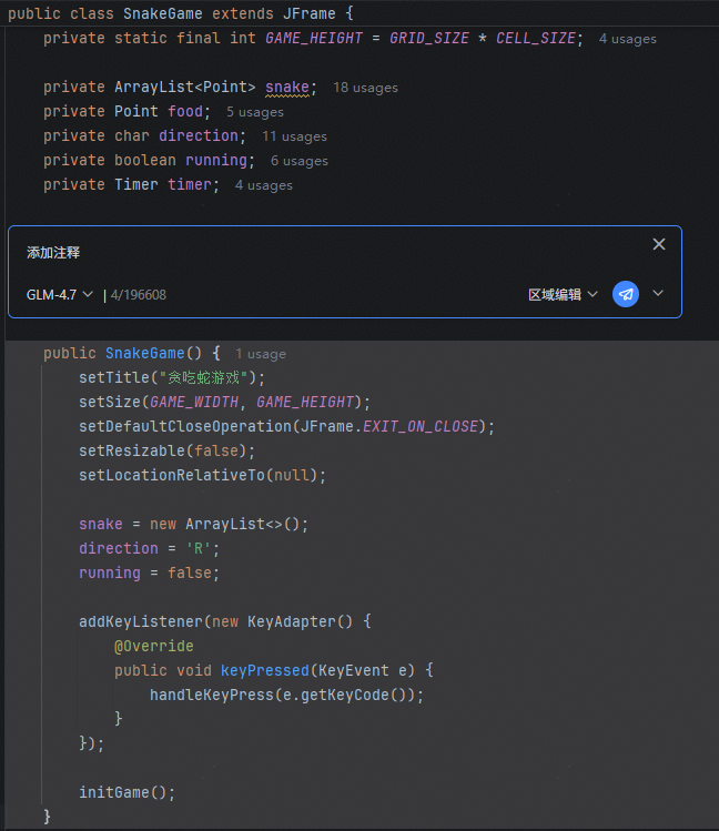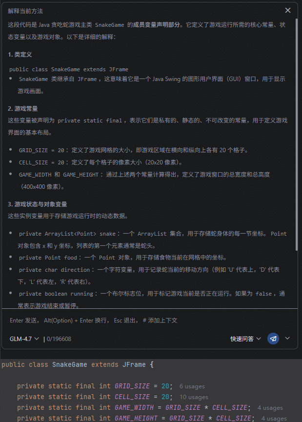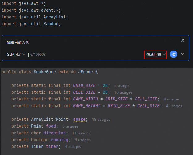 编辑区对话支持区域编辑和快速问答两种模式,请根据需要选择。本功能仅支持jetbrains系列的开发工具,此处以intellij idea为例。