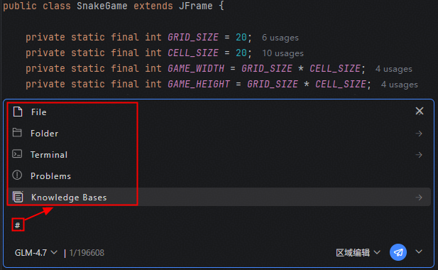 当前支持多种上下文来源,包括file(文件)、folder(文件夹)、symbol、git、terminal(终端)、problems(报错信息)和knowledge bases(知识库)等。所有上下文可自由组合,并与用户输入无缝联动,构建更丰富、更准确的问答场景。