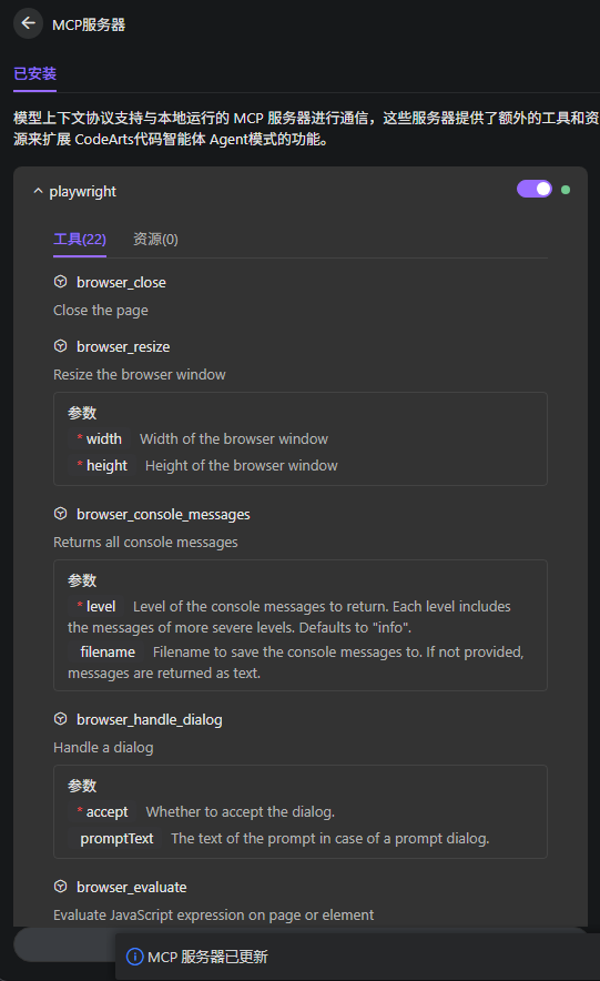 例如,您想通过直接操控浏览器完成网页导航、点击、输入、截图、数据提取等自动化操作。mcp_settings.json文件配置如下:{ "mcpservers": { "playwright": { "command": "npx", "args": [ "@playwright/mcp@latest" ] } } }此示例用户需要本地安装环境,推荐node-v24.x版本。您也可以通过与智能体交互,让智能体为您直接安装。