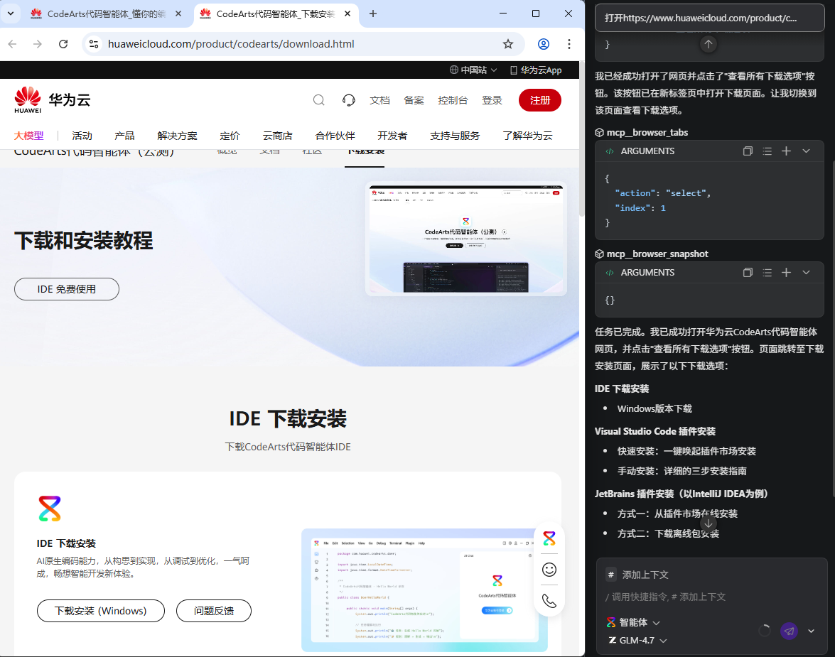 智能体调用 mcp服务器的方法,打开对应网页,并单击相应的按钮,跳转到对应的下载页。