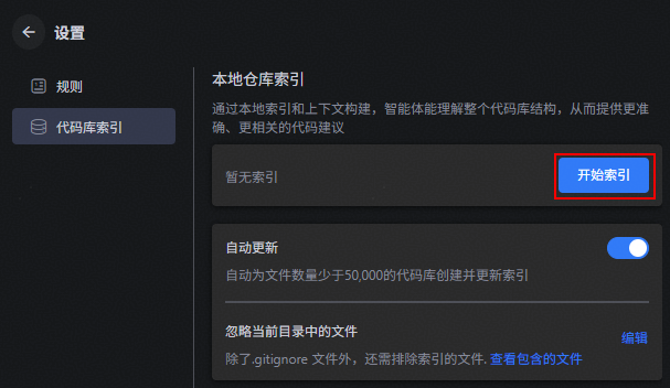 - 开始索引:本地代码仓中文件数量≥50,000个时,codearts代码智能体将需要您手动单击该按钮,来启动索引构建过程。