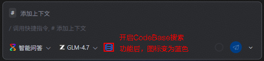 除了在设置中开启“codebase搜索”功能外,您还可以直接在聊天窗口的输入框下方单击