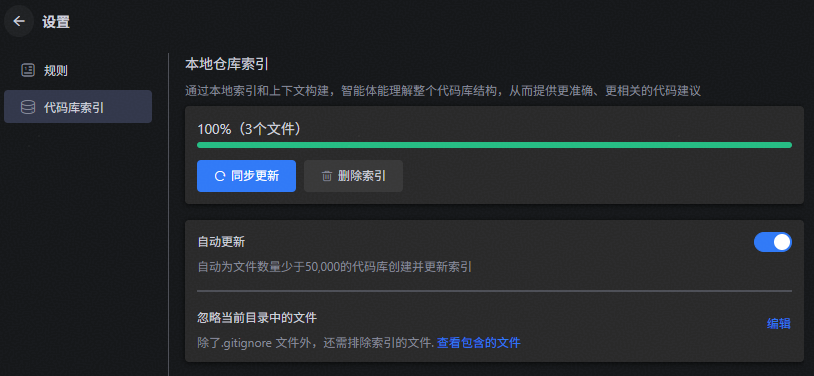 通过单击“编辑”按钮,您可以在“.codebaseignore”中指定当前目录下希望忽略的代码文件。设置后,这些代码文件将不被索引。