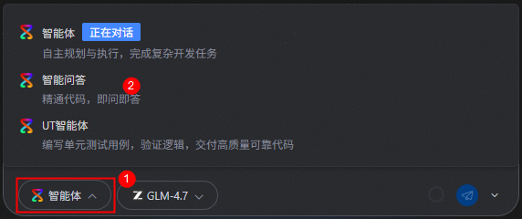 ,打开聊天窗口。 - 在聊天界面的输入框中,将模型切换为“智能问答”。