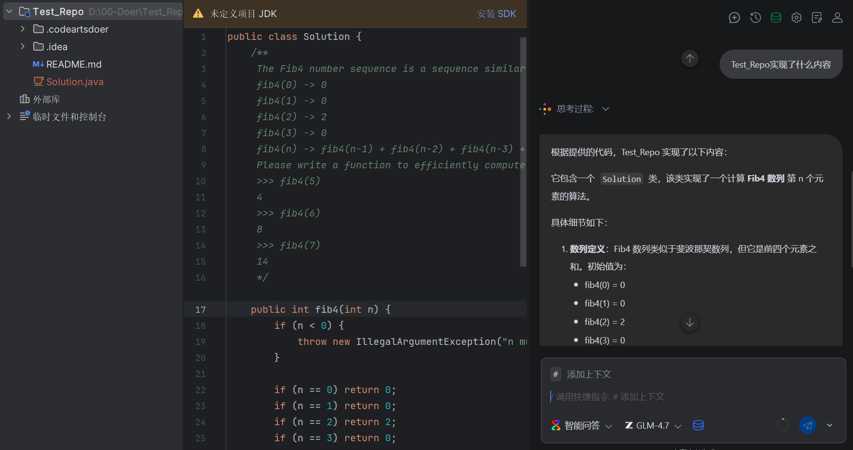 如下图所示,solution.java文件实现了一个计算fib4数列第n个元素的算法。