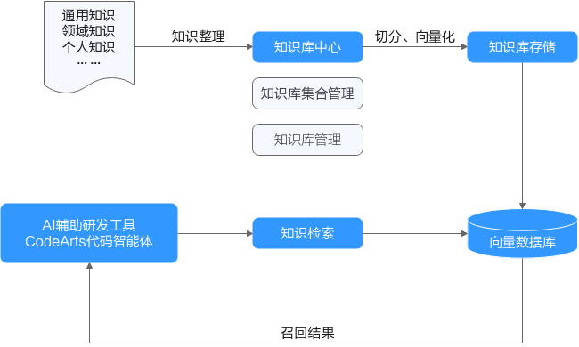 知识库集合是将用户上传的数据进行切片、模型向量化处理、索引过滤后入库形成的知识集合,按照实际使用维度进行划分。知识库集合本身不存储知识,只用于集中管理知识库。codearts代码智能体会基于这些知识库来完成知识的存储和查找。