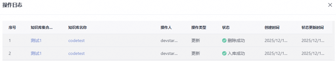 - 单击右上角“操作日志”,可查看所有知识库集合下知识库和文件的操作记录。