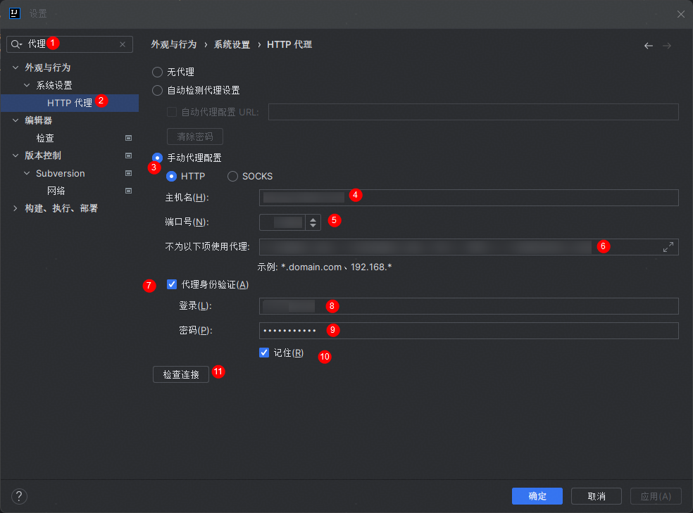 ,选择,进入intellij idea设置界面。 - 如下图所示,在设置页面搜索“代理”,单击“http代理”,参考下图填写代理信息。