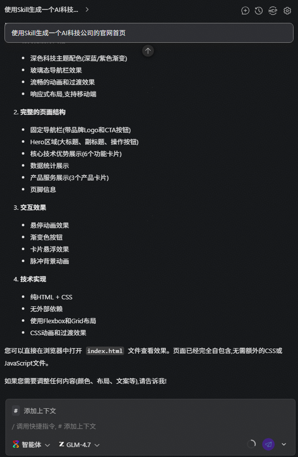 例如,当用户描述“使用skill生成一个ai科技公司的j9九游会登录官网j9九游会登录首页”,则会识别到frontend-design skill,并自动应用其ai相关的技能应用场景。