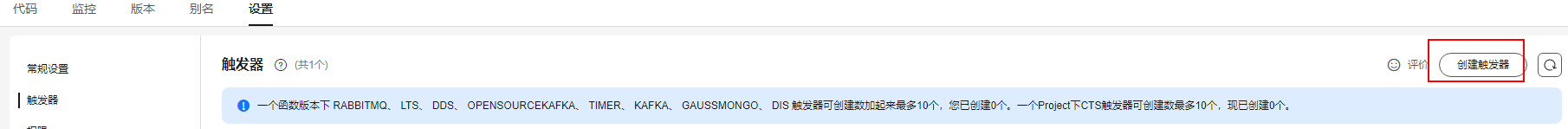 - 选择“设置 > 触发器”,单击“创建触发器”,弹出“创建触发器”对话框。