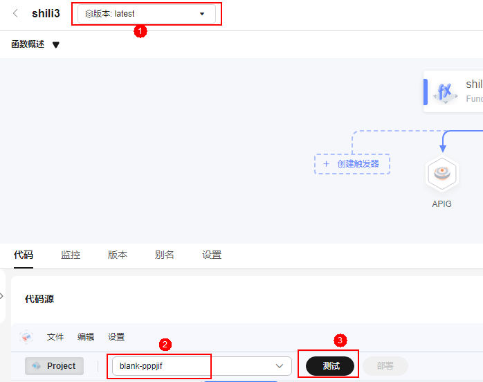 - 在函数详情页,如图1所示,选择函数版本,选择测试事件,单击“测试”。