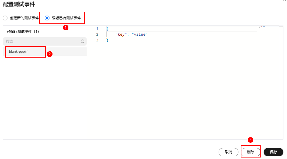 - 在函数详情页,单击“配置测试事件”,弹出“配置测试事件”页。