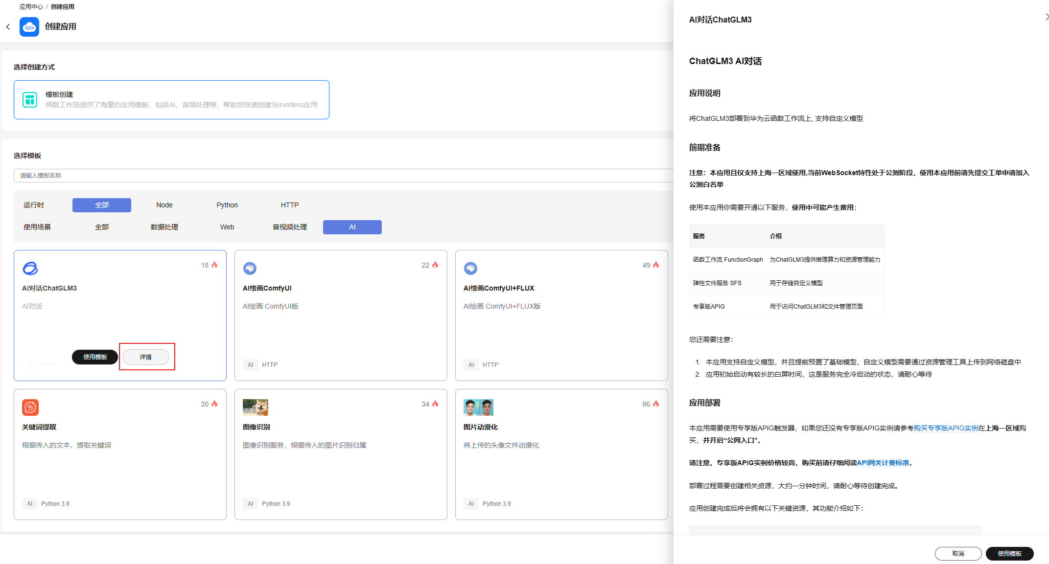 支持根据函数“运行时”和“使用场景”筛选函数模板,如图1所示单击函数模板的“详情”可查看该模板的使用描述以及注意事项。