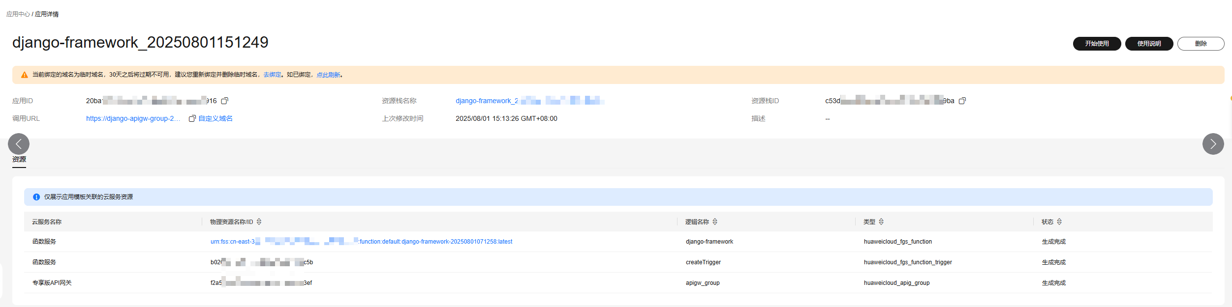 - 创建成功后如图3所示,将自动创建所需的函数资源及api网关资源,单击“物理资源名称”下的蓝色链接,可跳转至资源详情页。