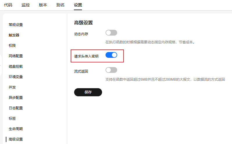 - 单击“设置 > 高级设置”,开启“请求头传入密钥”开关,单击“保存”,即可使用请求头传入密钥。