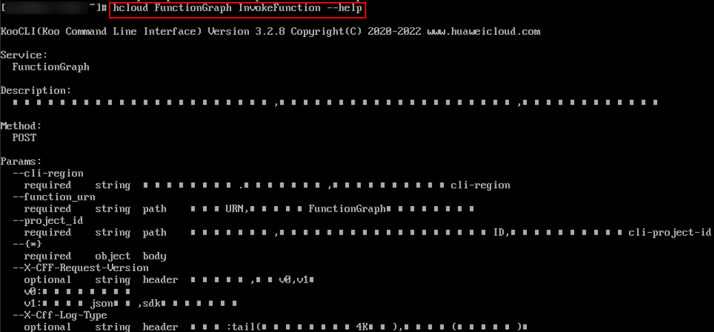 hcloud functiongraph invokefunction --cli-region="ap-southeast-1" --x-cff-log-type="tail" --x-cff-request-version="v1" --function_urn="urn:fss:cn-east-3:******:function:default:hcloud-invoke:latest" --project_id="******" --key="value"
