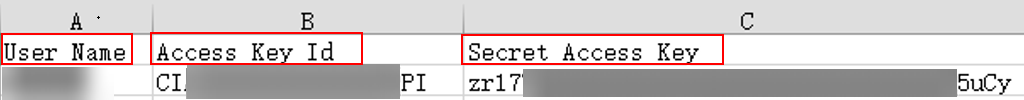 - 如果您有登录密码,可以登录控制台,可以在我的凭证中获取自己的访问密钥ak/sk。请参见:新增访问密钥。可以下载得到ak/sk文件,文件名一般为:credentials.csv。如下图所示,文件包含了用户名称(user name),ak(access key id),sk(secret access key)。