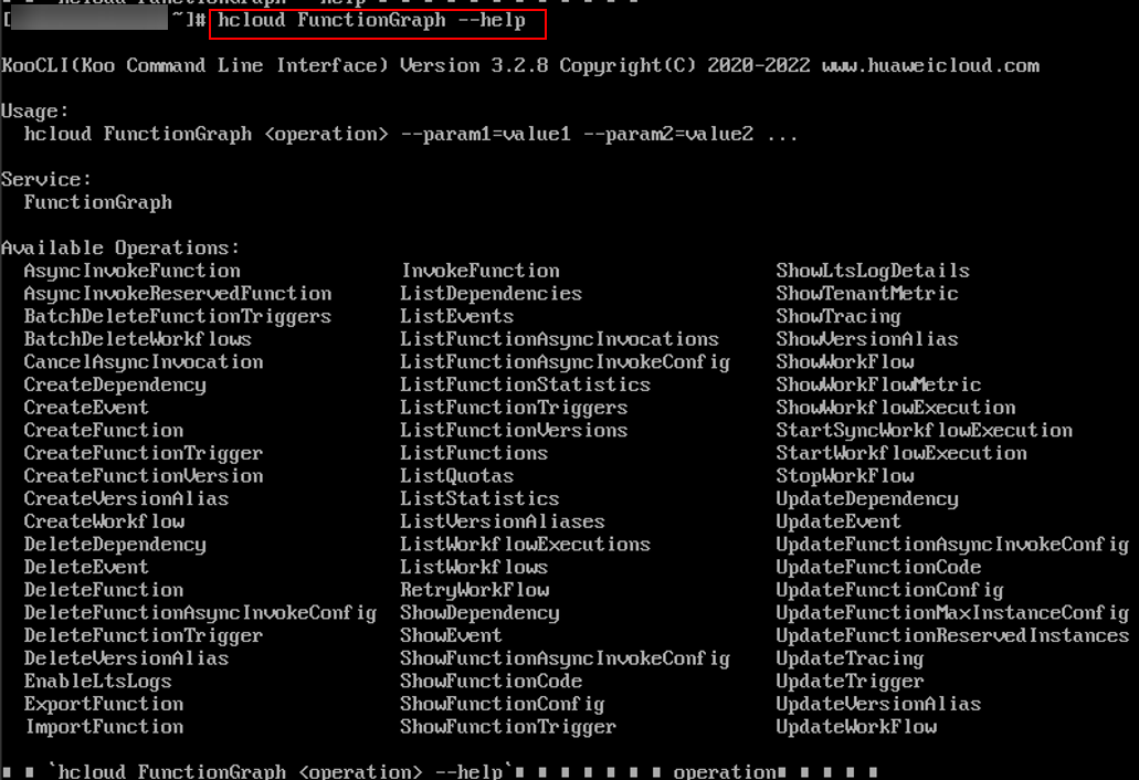 - 执行如下命令,查看functiongraph支持命令。如图4所示,“available operations”中返回了functiongraphj9九游会登录的服务支持的operation列表。