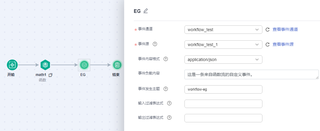 函数流支持配置事件网格服务(eg)服务组件,eg节点会发布已配置的事件至指定的eg事件通道,如何创建eg资源请参见。