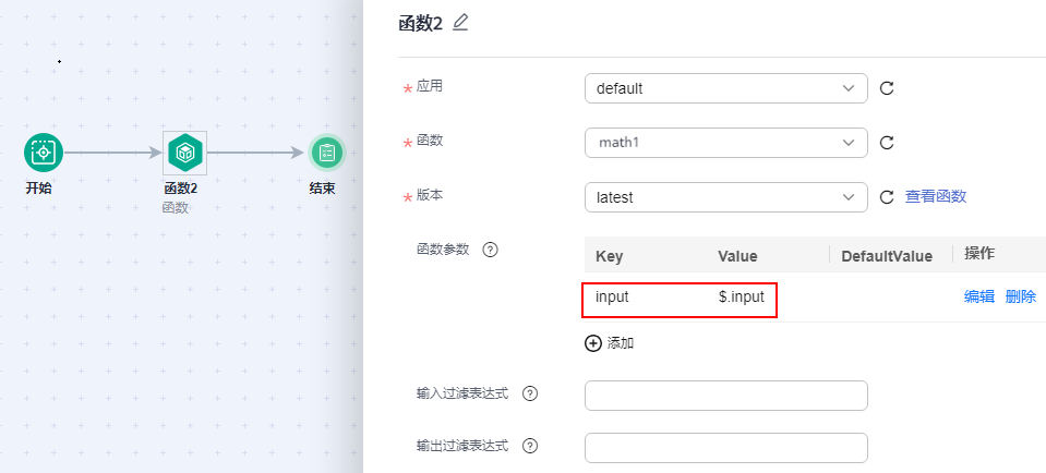函数执行时的入参,以键值对形式传入,'值'可自定义常量或通过jsonpath表达式从启动时的'定义输入值'和前置节点的输出信息中获取,请谨慎输入密码等敏感信息,敏感信息请自行加密,防止信息泄露! 流程中以json格式作为body参数在执行时传入函数。 key:填写参数。 value:填写参数值。 defaultvalue:设置默认值,参数未获取到值时,默认获取默认值。 操作:编辑或删除设置的参数。 |